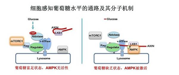 该课题组在研究中发现,无论在不含葡萄糖培养条件下的细胞里,还是在饥饿后的动物体内,都不能观测到AMP水平的上升。葡萄糖水平下降将引起的葡萄糖代谢物——果糖1,6-二磷酸(fructose-1,6-bisphosphate,FBP)水平的下降,该过程进一步地被糖酵解通路上的代谢酶——醛缩酶(aldolase)感应,后者将启动课题组先前发现的激活AMPK溶酶体途径。当aldolase不与FBP结合时,会促进上述溶酶体途径中活化AMPK蛋白质复合体的形成。进一步研究表明,不与FBP结合的aldolase突变体在高糖条件下仍然激活AMPK,而另一种能持续结合FBP但催化活力缺失的aldolase突变体则会即使在低糖条件下抑制AMPK激活。重要的是,该项新成果揭示了在细胞中,葡萄糖缺失但尚未改变AMP水平时,AMPK就能被激活的一条全新的、完全建立在实际的生理情况上的通路。该通路的另一含义是,葡萄糖能做为一个“信使”,其多与少可以改变细胞代谢状态,为代谢性疾病的诊疗提供了新的策略。